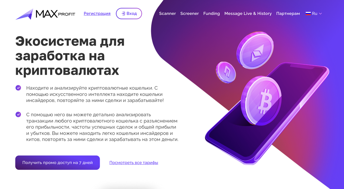 В современном мире криптовалюты открывают безграничные возможности для заработка, но чтобы воспользоваться этими возможностями, необходимы не только знания, но и правильные инструменты. Проект MaxProfit.cc предоставляет полный набор инструментов для успешной работы с криптовалютами, включая арбитражные сканеры и скринеры, анализ децентрализованных кошельков, а также обучение от ведущих экспертов.