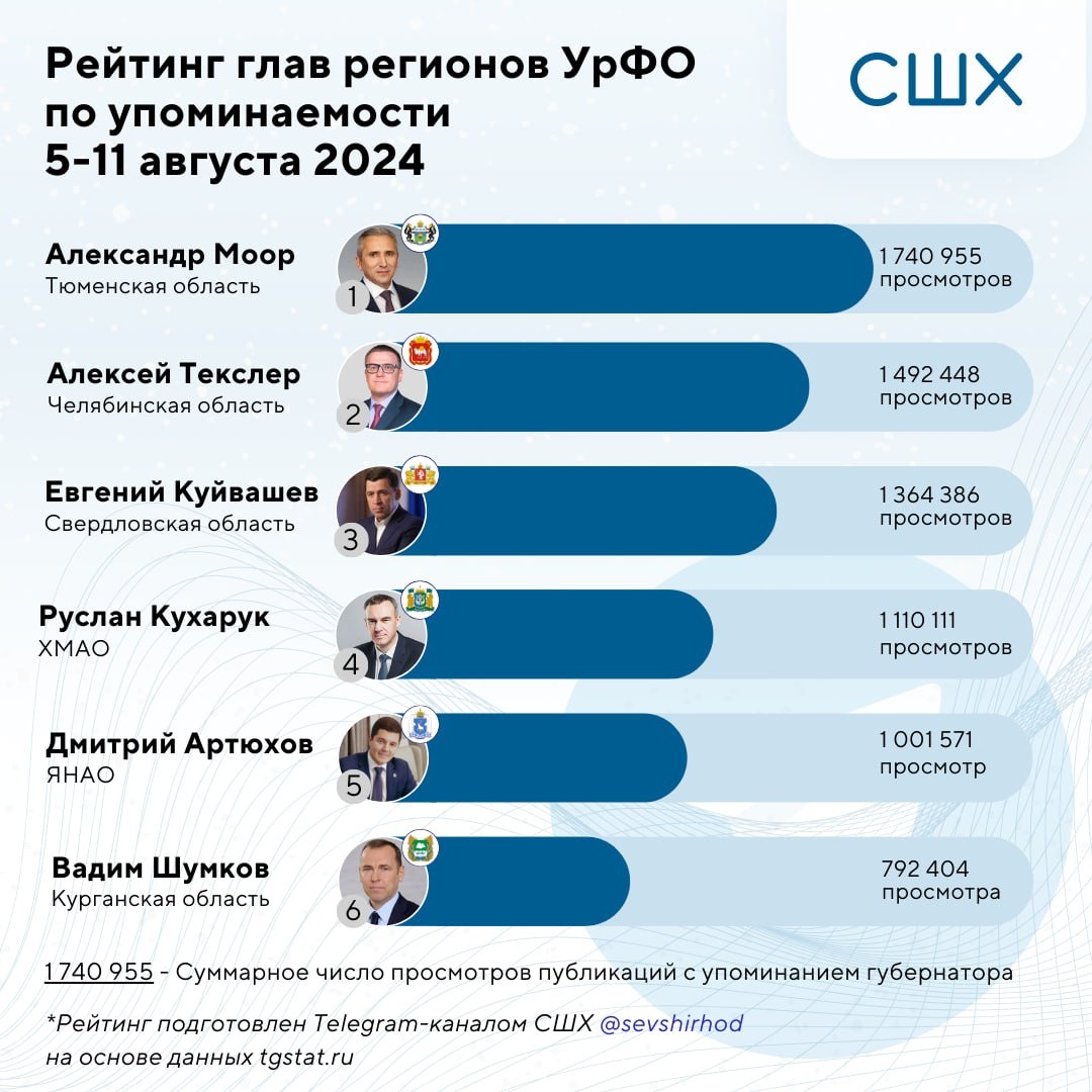 Лидером недели стал губернатор Тюменской области Александр Моор с 1 740 955 просмотрами и 410 публикациями. Внимание каналов обеспечила оперативная готовность помочь Курской области, пострадавшей от обстрелов украинских боевиков. Моор смог не только выразить поддержку, но и не забыл поддержать военных. Без шуток – ставим пять за расторопность.