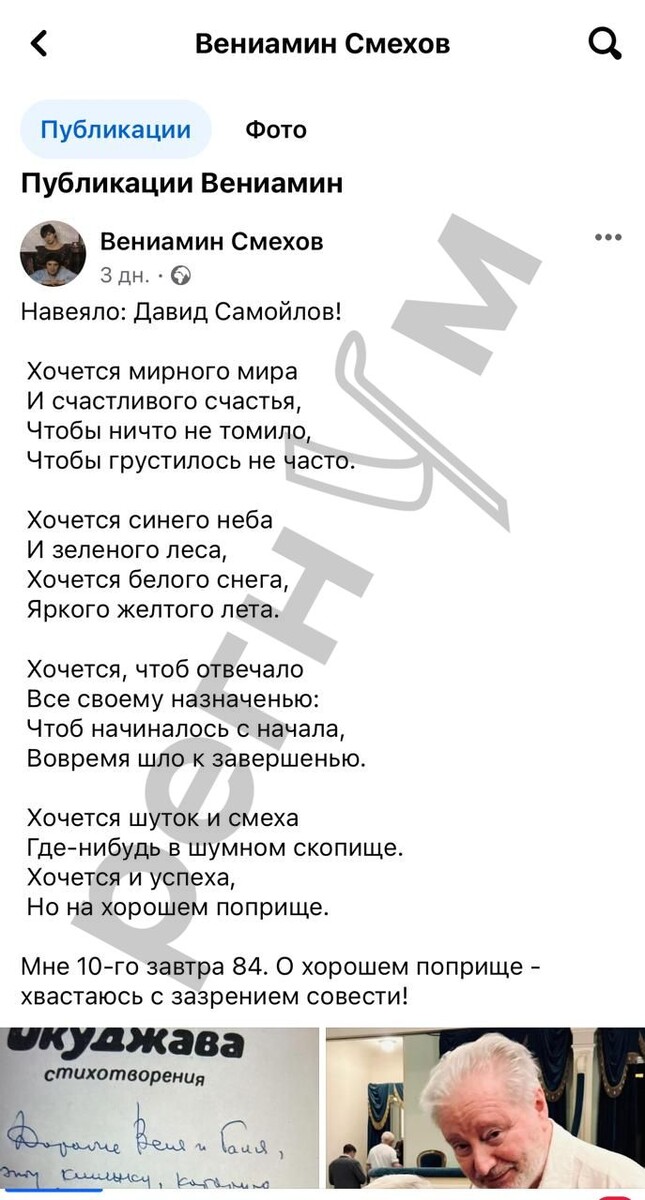 Пару дней назад благородный Атос, граф де Ла Фер, мистический Воланд и просто отличный актер Вениамин Смехов отметил свой 84-ый День рождения. Будучи человеком публичным, отметил в соцсетях, опубликовав поздравительные стихи самому себе и фотографии своих самых близких друзей и самых любимых коллег. Стихотворный пост дополнил "актерский фотоальбом" Смехова. С любимыми друзьями: новоявленным гражданином Литвы Александром Филиппенко, гражданкой Латвии Чулпан Хаматовой, "американцем" Данилой Козловским, осужденным за мошенничество в особо крупных размерах "французом" Кириллом Серебрениковым, маякующей сердечками в комментариях сторонникам Украины Ириной Пеговой, автором антироссийского "За нас с вами" - тестем Анатолия Чубайса Андреем Смирновым, желающим избавиться российского президента в своей песне поэтом Юлием Кимом, сбежавшим от мобилизации "немцем" Никитой Кукушкиным. "Чулпан Хаматова - чудо театра и чудо экрана!" - подписал свое опубликованное фото с новоявленной гражданкой Латвии
