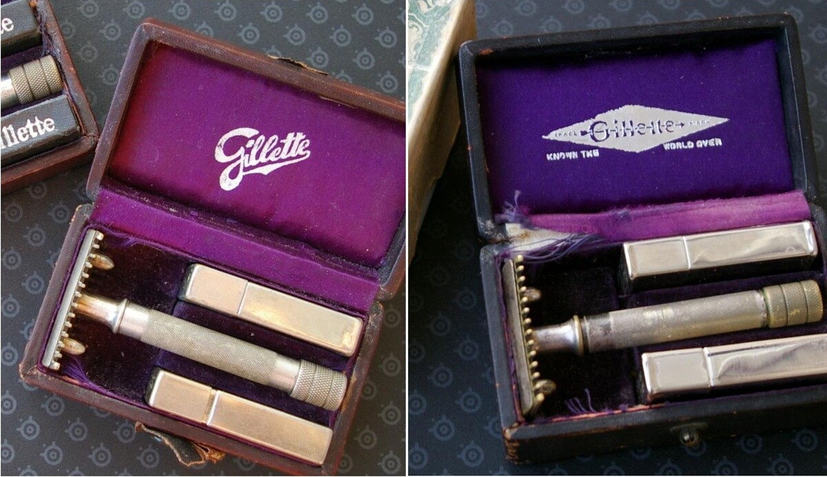 Фирменный ромбовидный логотип "Gillette", так называемый "Diamond Logo" появился в 1908 году, в сентябре - на лезвиях, в канун Рождества - на гребёнках бритв и футлярах. До этого имя "Gillette" писалось курсивом. В том же 1908 году был короткий промежуток времени, когда компания выпустила небольшое количество бритвенных станков с "улучшенным" факсимиле подписи изобретателя и основателя компании на гребёнке. Канада вступила в Первую мировую войну 5 августа 1914 года. Как часть Британской империи, она приняла участие в войне на стороне Антанты, России, Франции и Великобритании. США вступили в Первую мировую войну 6 апреля 1917 года. До этого они сохраняли нейтралитет. Компания "Gillette" отреагировала на это важное событие выпуском "Service Set" для мобилизованных и добровольцев. также поступила и на фабрике "Gillette" в Монреале. На канадском футляре для бритвы был помещён герб Канадской конфедерации. "1 июля 1867 года британские колонии Онтарио, Квебек, Новая Шотландия и Нью-Брансуи