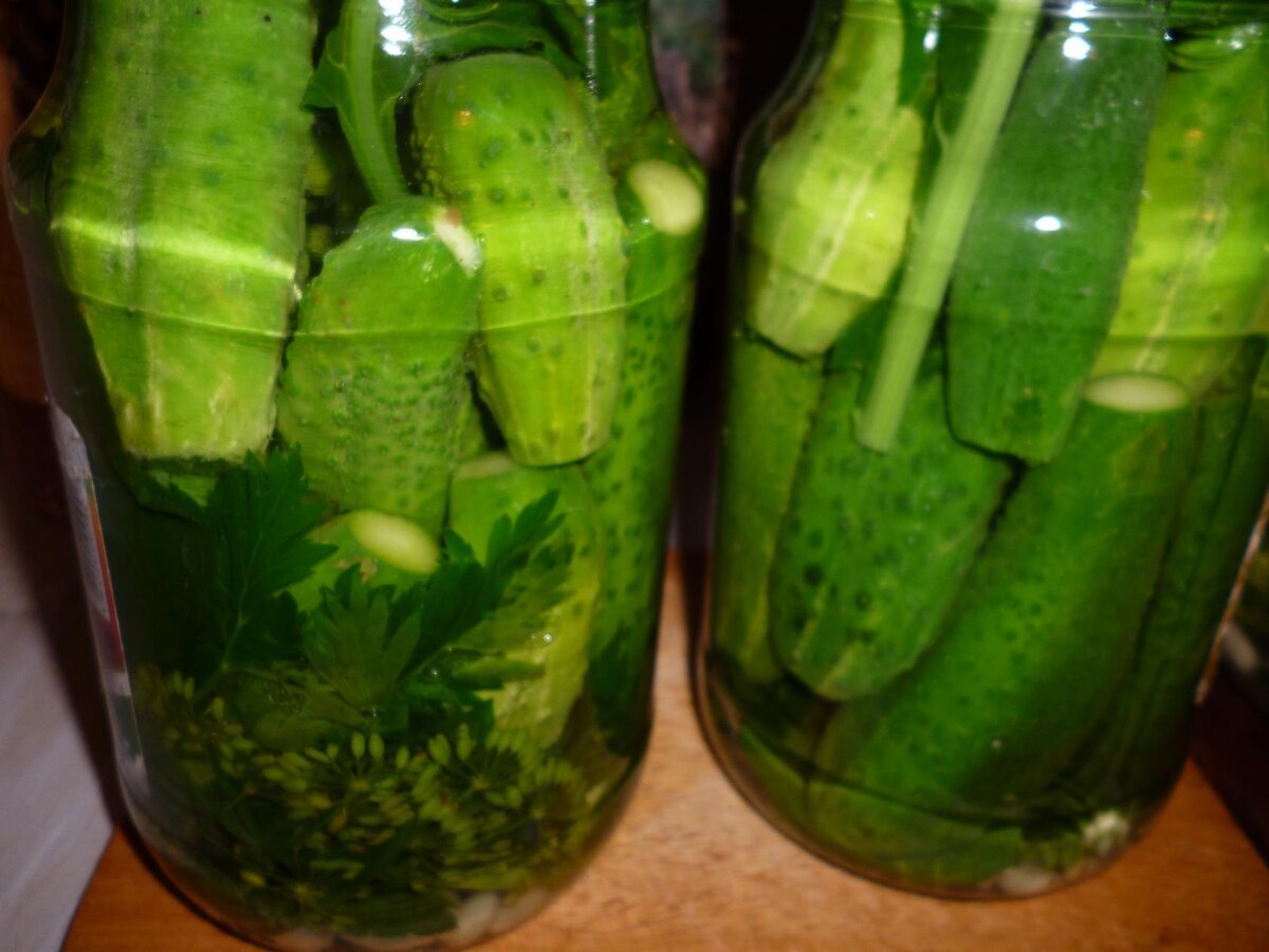 На дно банки нарезать: - 1 небольшую луковицу кольцами, - нарезать 1-2 зубчика чеснока, - нарезать стебли укропа, - 5-8 шт. черного перца горошком, - 2-3 шт. гвоздики, - 5 лавровых листиков. Заложить огурцы,залить кипятком и оставить на 10-15 минут. Воду слить. Маринад на 0,5 литра воды: - 4 ст.л. 9 % уксуса, - 4 ч.л. сахара, - 2 ч.л. соли. Вскипятить, залить банки, закатать. Приятного аппетита!