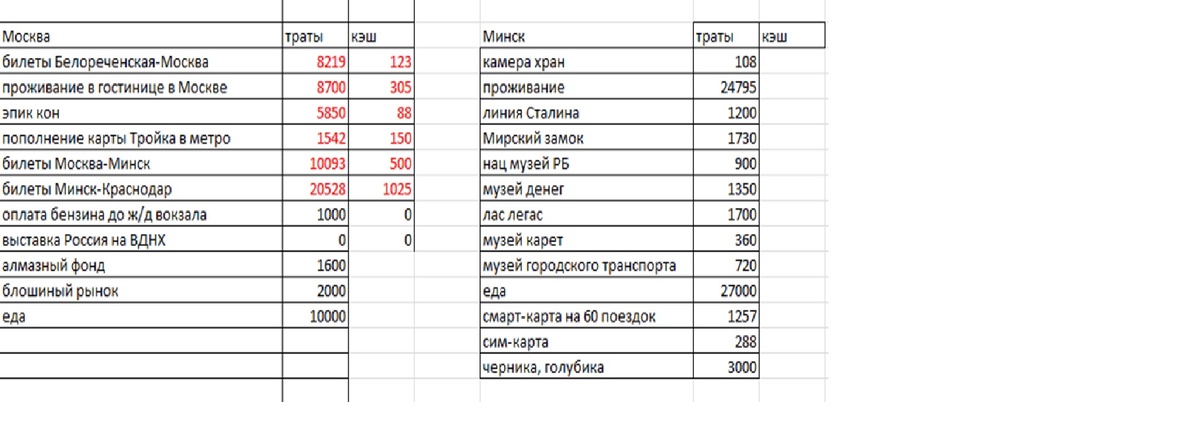 Я продолжаю планировать поездку и вот как преобразуется таблица. Красным выделила уже подтвержденные траты и полученный кэшбек.