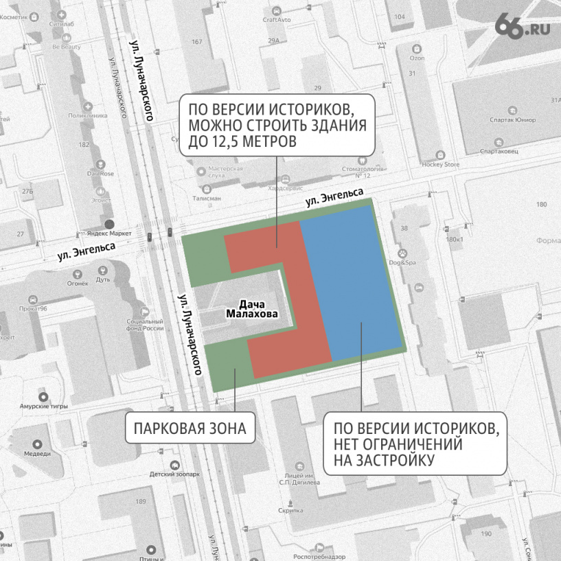 Строительство здания в сквере рядом с домом Малахова не навредит памятнику архитектуры. К такому выводу пришли эксперты, которые рассматривали проект объединенной зоны охраны на той территории. Региональное управление госохраны объектов культурного наследия (ОКН) опубликовало историко-культурную экспертизу квартала вокруг дома Малахова. Заказчиком выступила компания «ЮК Барристер», которая в июне обнесла сквер на Луначарского забором. Тогда о каких-то конкретных планах организации не было известно. Разработчики разделили территорию на несколько подзон с разным режимом использования. В сквере перед домом Малахова, согласно заключению историков, ничего нельзя строить — только устанавливать временные бытовки, рекламные конструкции или малые архитектурные формы. Зато площадка за памятником — как раз та, где появился забор — получила статус Единой зоны регулируемой застройки (ЕЗРЗ-1). Это значит, что там допускаются капитальные объекты высотой до 12,5 метров (приблизительно три этажа) и под