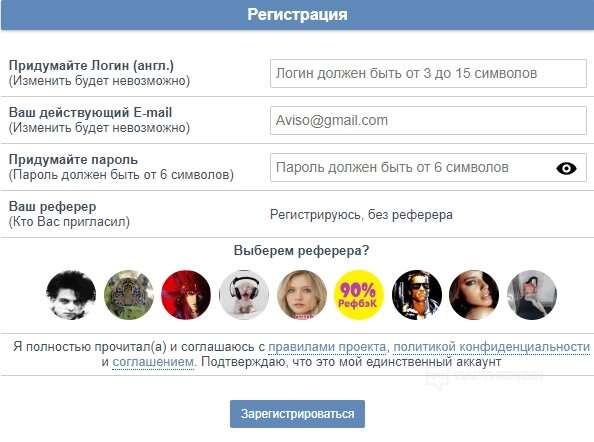 Чтобы создать аккаунт, необходимо в правом верхнем углу выбрать пункт «Регистрация». На новой странице следует указать следующую информацию: