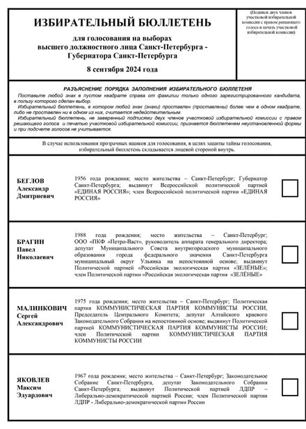 Санкт-Петербургская избирательная комиссия 13 августа утвердила текст, число и распределение избирательных бюллетеней, которые будут изготовлены к выборам губернатора Петербурга, сообщил глава Горизбиркома Максим Мейксин. Фамилии кандидатов расположили в алфавитном порядке. В рамках избирательной кампании на должность губернатора Петербурга зарегистрированы четыре кандидата. К концу июня количество претендентов на этот пост составляло 22 человека. Первым в списке заявлен действующий губернатор Александр Беглов ("Единая Россия"), далее следует муниципальный депутат Павел Брагин (партия "Зеленые"). На третьей строчке лидер "Коммунистов России" Сергей Малинкович. Четвёртым в списке заявлен депутат парламента Петербурга седьмого созыва от ЛДПР Максим Яковлев. Глава ГИК Максим Мейксин также уточнил, что утверждены тексты избирательных бюллетеней, в том числе используемых на избирательных участках с КОИБ. Выборы губернатора Северной столицы пройдут с 6 по 8 сентября 2024 года в единый день г