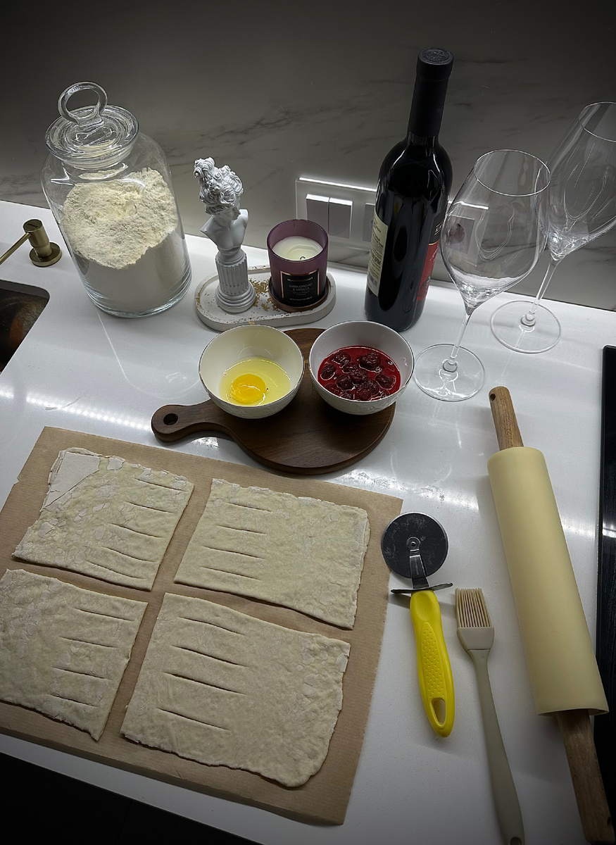 Ингридиенты: Приготовление: Тесто и вишню разморозить. Вишню смешать с сахаром и крахмалом. Тесто раскатать и разделить на 4 прямоугольника. На тесто выложить по 1 ст.л начинки, на свободной части теста сделать надрезы. Начинку накрыть и закрепить края вилкой, формируя заготовку будущей слойки. На пергамент выложить слойки, смазать яйцом. Выпекать в заранее разогретой духовке 30 минут при температуре 180 градусов. Готовые слойки можно посыпать сахарной пудрой. Приятного аппетита🤍