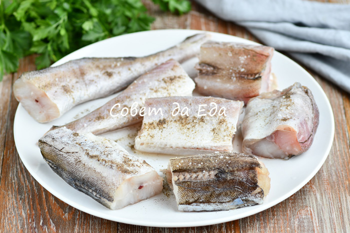 Минтай (2 тушки, общий вес 700 г) заранее размораживаем, удаляем плавники, внутренности и промываем. Разрезаем на порционные куски (у меня 7 шт.), посыпаем со всех сторон солью и молотым перцем. Отправляем рыбу в яичный маринад.