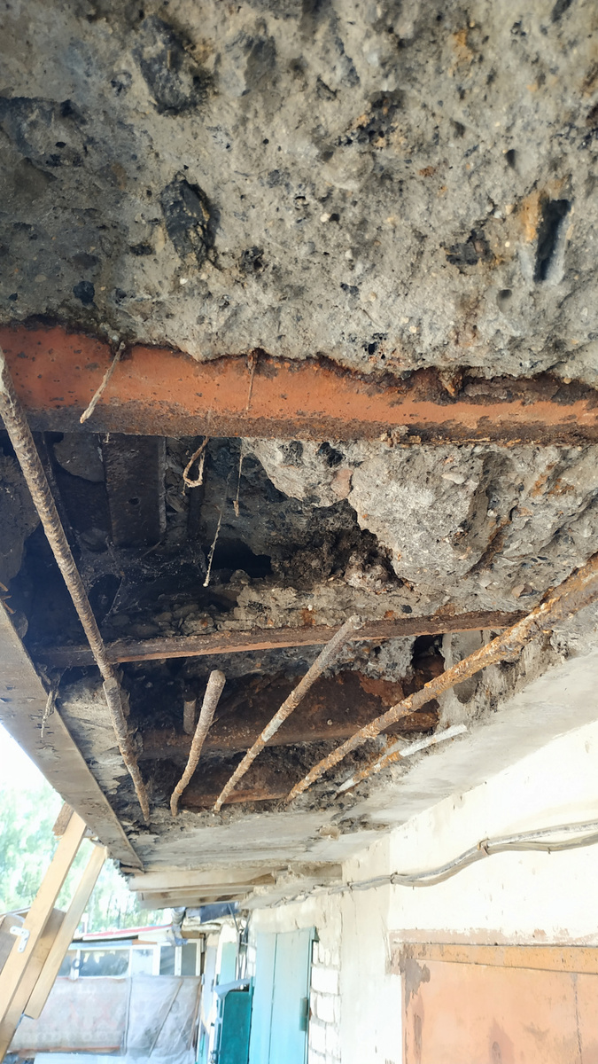 Как оказалось потом, после разбора, первопричина разрушения козырька была в крыше, из-за того, что покрытие на крыше не было герметичным, во внутрь плит перекрытия затекала вода, после чег