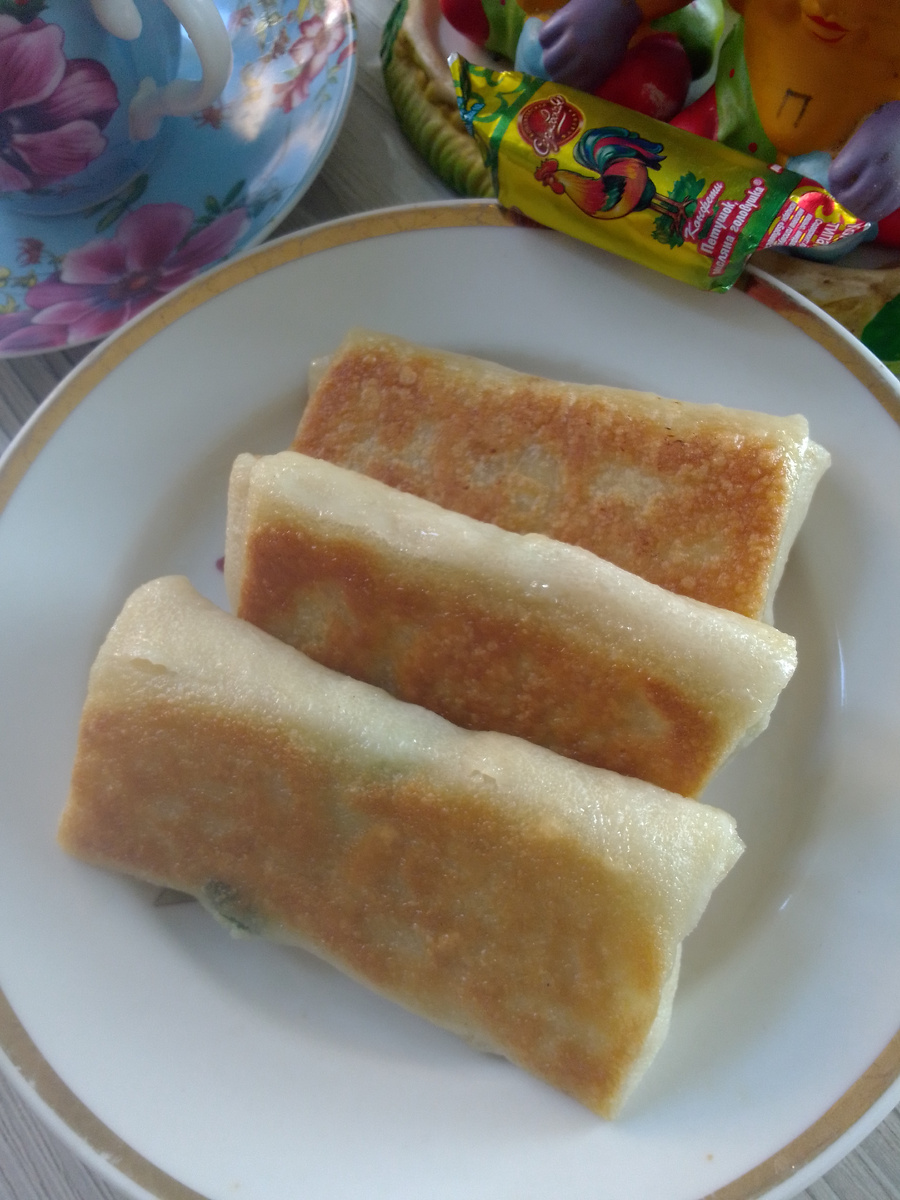 Пусть сегодня с самого утра все будет лучше, чем вчера. Доброе, доброе утро! С вами Надежда, и я приглашаю вас на мою кухню, где покажу вам наше меню на день. Сегодня так плохо спала, уснула уже около 5 часов, всю ночь лил дождь, а утром ( я встала около 9 часов) светило яркое солнышко, муж уехал на квадроцикле на рыбалку, даже не слышала, как уехал. Вышла утром с собакой погулять и увидела на дорожке какую – то зверюшку, она от меня была в метрах 6, разглядеть не смогла, так как я плохо вижу, хотя и в очках, но она быстро промелькнула, мне сначала показалась, что это маленький рыженький котенок, но хвост пушистый как у белки. Но откуда у нас белки? Лес правда недалеко, но небольшой, а белок в нем отродясь не бывало, а вот ежи есть, даже иногда приходят к нам. Жалко, не было с собой телефона! Но пора готовить завтрак. Завтрак: фаршированные блины с яйцом и зеленым луком, которые я делала вчера, осталось только обжарить на смеси растительного и сливочного масла, вкусные с хрустящей под