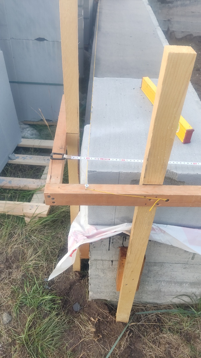Наглядный и понятный способ выведения размеров при закладки первого ряда блоков, горизонтальный брусок выставляется по лазерному уровню(высота первого ряда) , а уже углы корректируются при помощи саморезов на основании измерений длин сторон и корректировки по диагоналям