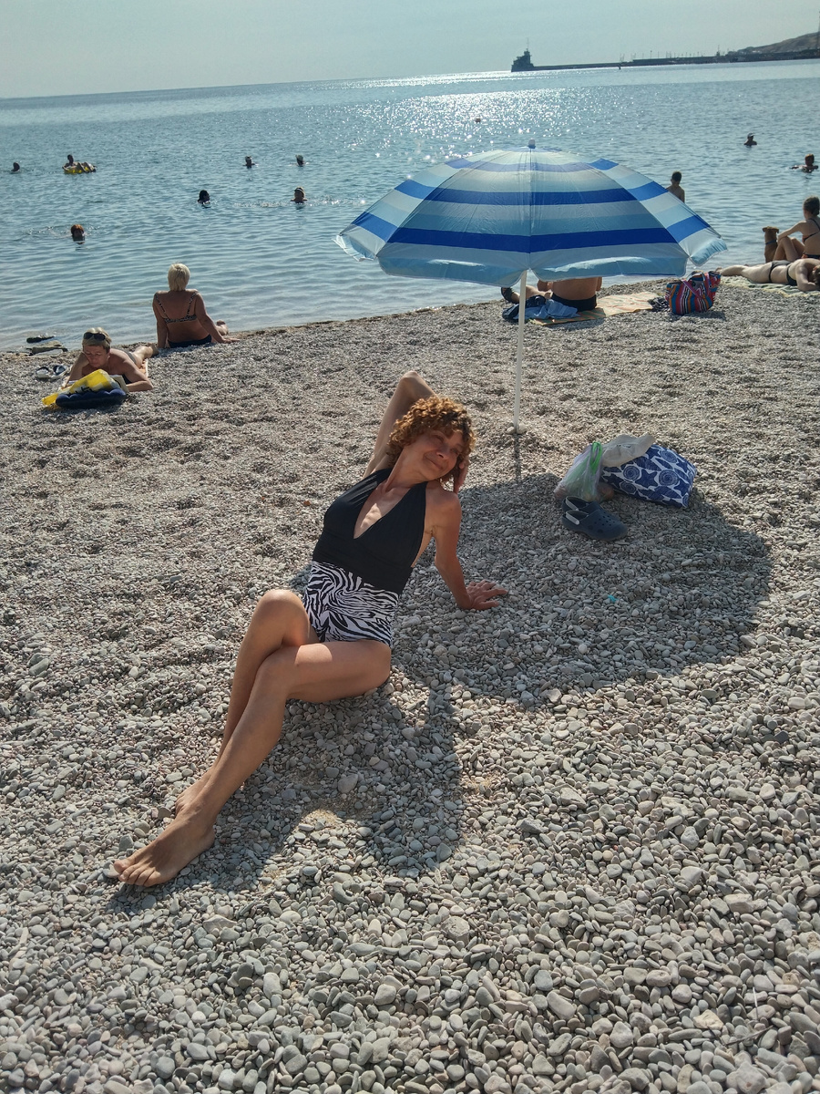 На грани солнышка и тени Лежу в изнеможеньи лени И солнца жаркая рука Меня хватает за бока... До моря лень пройти два метра, Гонимая порывом ветра, Я как осенний лист несусь И рыбкой в море окунусь...