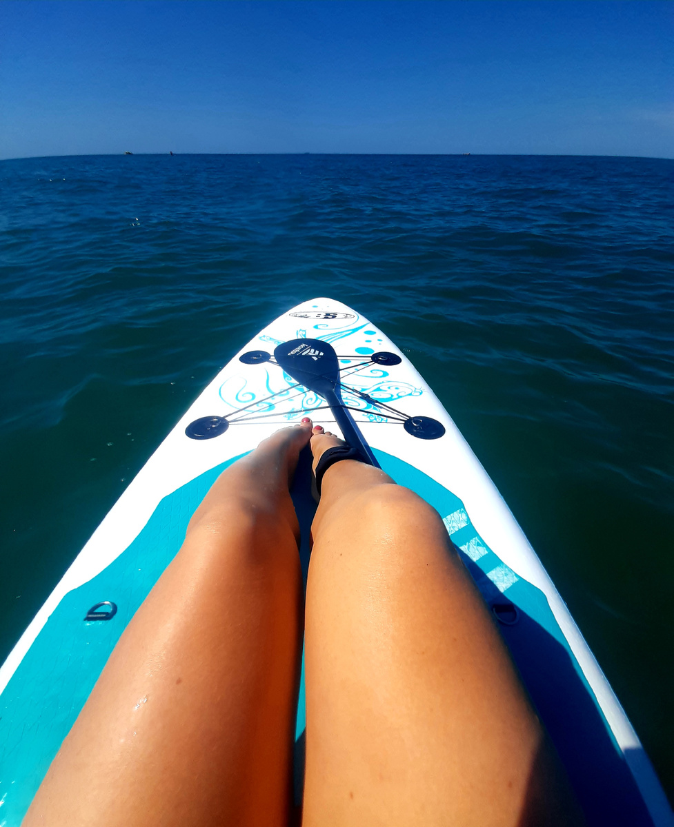 Мой первый раз на сапах случился на море, в Джемете. Модная ныне тема, а я до этого ни разу не управляла доской. Симпатичный парень рассказал и объяснил, как управлять веслом, как лучше сесть (встать я пока так и не рискнула), но расслабившись, я даже смогла полежать) Мне показалось, что в управлении чем-то напоминает байдарки. Принцип тот же. Руки прямые, грести ближе к доске. Почувствуй и поймешь, как управлять, куда грести. С волнами, конечно, вдвойне веселее. Стоимость оказалась гораздо ниже, чем я думала. 400 рублей за полчаса и 800 рублей за час аренды, залог не нужен. Круто, у нас на малой родине чуть дешевле на реке: 400 рублей за час за один сап, и по 300 за час при условии аренды двух. Но получилось впервые здесь, на чистом и слегка волнистом Черном море, а не на родной реке Матыра. Больше всего боялась врезаться в головы отдыхающих людей у берега, или что отнесет далеко, и не смогу вернуться, или столкнуться с катамаранами, бананами или плюшками. Это не давало до конца рассл