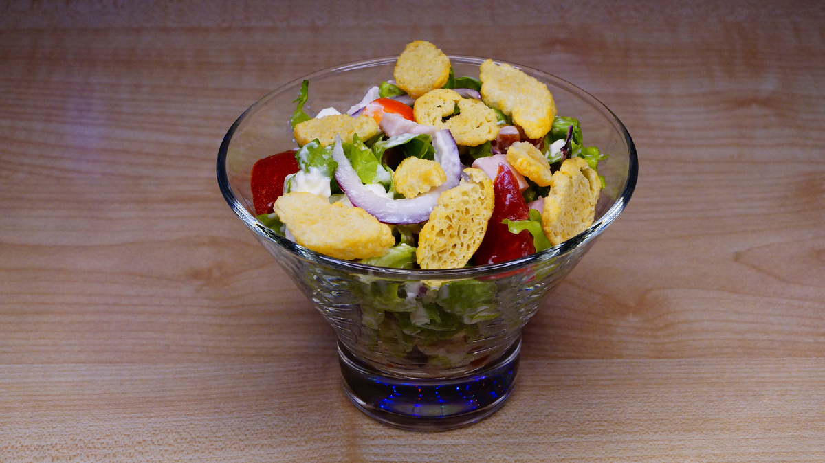Салат, ветчину, помидор, перец, брынзу порезать кубиком, лук – полукольцами. Заправить сметаной, перед подачей посыпать сухариками.