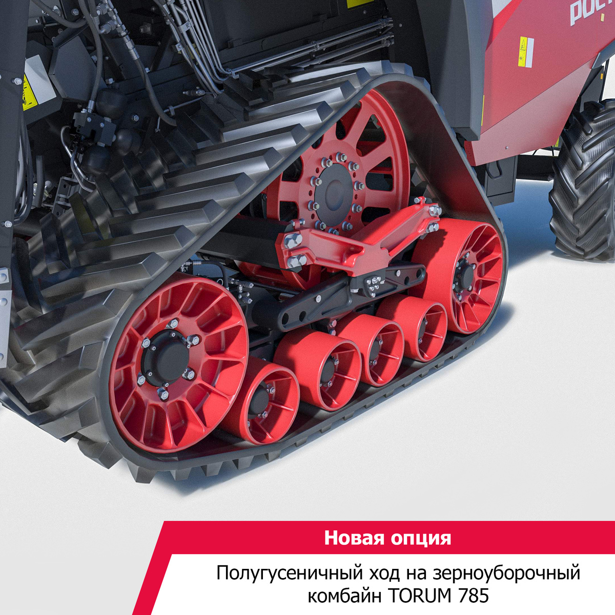 Ростсельмаш предложил аграриям новую опцию — полугусеничный ход (ПГХ) на зерноуборочный комбайн TORUM 785. Ходовая часть с резиноармированной гусеницей разработана научно-техническим центром компании. TORUM 785 является самым производительным зерноуборочным комбайном Российской Федерации. Эффективная машина позволяет собирать до 45 тонн в час основного времени на зерновых и обмолачивать за сезон до 2000 га. Уникальное решение Advanced Rotor System — ротор с вращающейся декой — делает комбайн идеальным на уборке влажных хлебов и риса. ПГХ расширяет диапазон использования TORUM 785, особенно на переувлажненных почвах, в условиях, труднопроходимых для колесной техники. Также за счет большого пятна контакта в 2,5 кв. м ПГХ уменьшает удельное давление комбайна на грунт минимум в два раза. Это помогает сохранять структуру почвы, снижает ее уплотнение, что, в свою очередь, способствует повышению урожайности и улучшению экологической ситуации. Таким образом, комбайн с полугусеничным ходом я