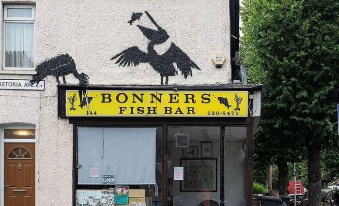 Уличный художник-аноним Бэнкси представил в пятницу (9 августа) еще одну работу на тему животных — уже пятую на этой неделе. Он подтвердил в Instagram, что именно он - автор новой работой с изображением двух пеликанов над закусочной, торгующей рыбой и чипсами, на северо-востоке Лондона, как и в случае с предыдущими работами. Птицы изображены силуэтами, ловящими рыбу на вершине Bonners Fish Bar в Уолтемстоу, на северо-востоке Лондона. Одна из социальных сетей прокомментировала пост Бэнкси в Instagram: «Ценность Bonners Fish Bar выросла всего в 10 раз за ночь!». На этой неделе Бэнкси каждый день публиковал изображение новой работы на тему животных. Как и в случае с работами, представленными ранее на этой неделе, художник не дал никаких намеков на более глубокий смысл, просто опубликовав изображение работы без подписи. Но в сети много разговоров о значении этой серии о животных. Учитывая недавние крайне правые беспорядки в Великобритании, одна популярная теория предполагает, что Бэнкси
