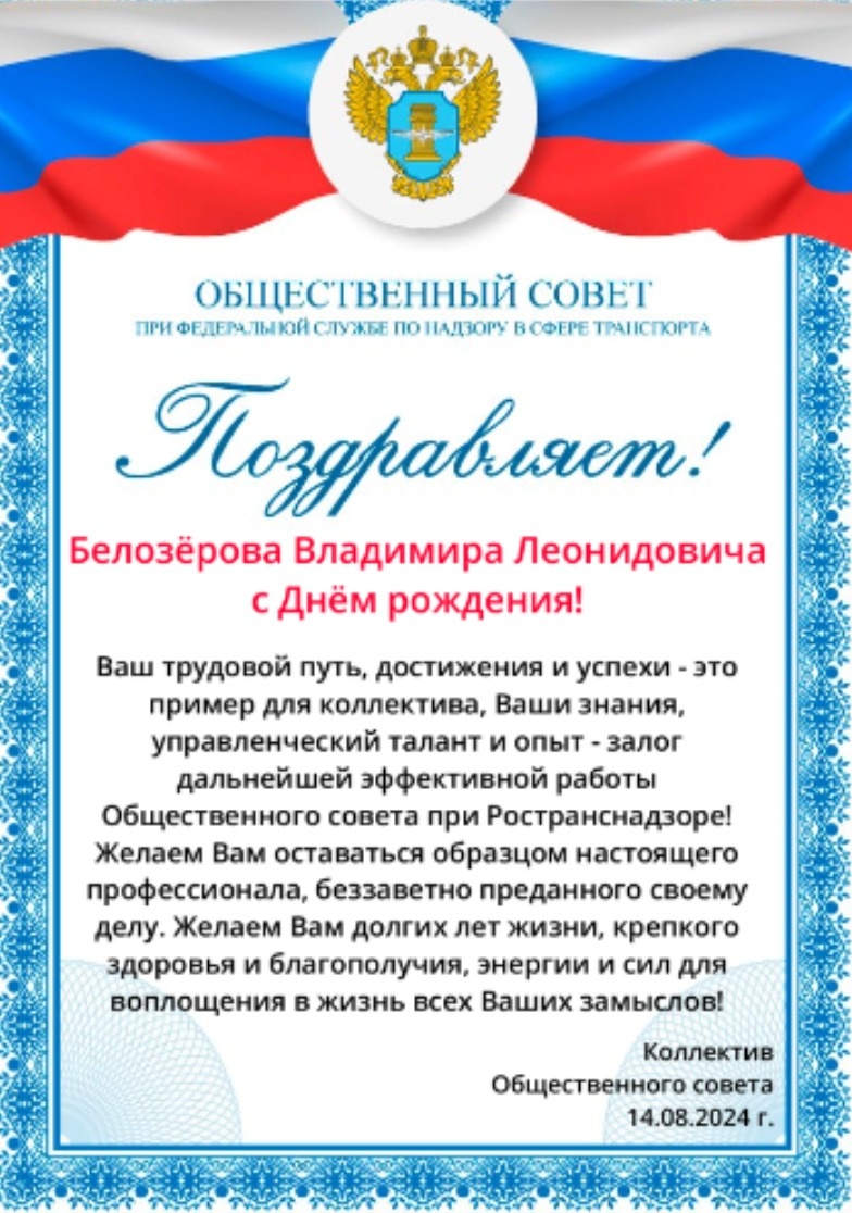 Уважаемый Владимир Леонидович! С Днём рождения! Ваш трудовой путь, достижения и успехи — это пример для коллектива, Ваши знания, управленческий талант и опыт — залог дальнейшей эффективной работы Общественного совета при Ространснадзоре. Желаем Вам оставаться образцом настоящего профессионала, беззаветно преданного своему делу. Желаем Вам долгих лет, крепкого здоровья и благополучия, энергии и сил для воплощения в жизнь всех Ваших замыслов! https://osrostransnadzor.ru/belozerov-140824/