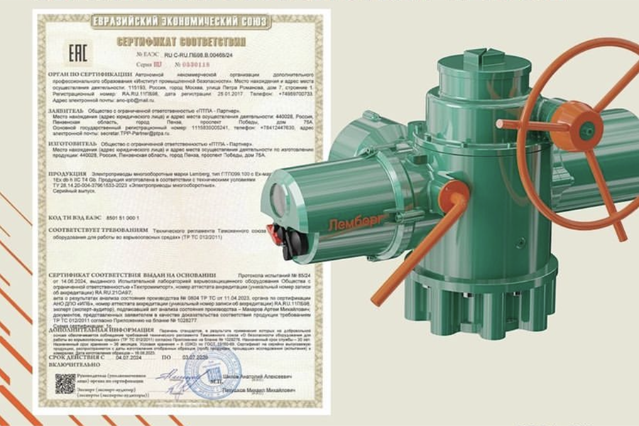 Компания «ПТПА-Партнер» получила сертификат соответствия ТР ТС 012 на электроприводы торговой марки «Лемберг». Это подтверждает успешное прохождение лабораторных испытаний и соответствие оборудования и Ех-компонентов требованиям безопасности для работы во взрывоопасных средах.