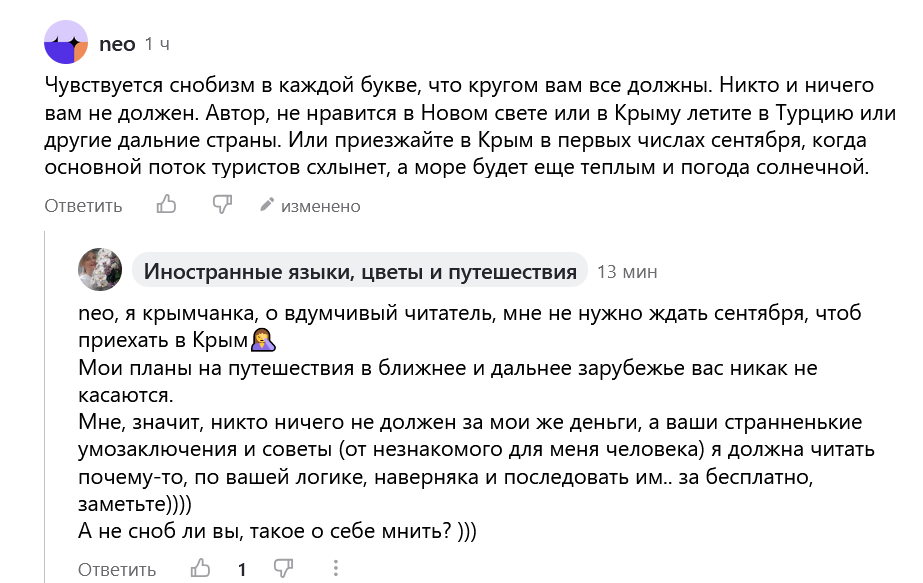 Предупреждение: статья адресована только некоторым комментаторам (не всем) под постом о Новом Свете, а также тем, кто лайкает и поддерживает это. Это для тех, кто думает, что можно прийти и оскорбить незнакомого человека просто так. Всех остальных обидеть не хотела и рекомендую им это не читать. Отношусь к людям так, как они ко мне. Настоящим мужчинам из комментариев посвящается. Ну что, мужики, давайте поговорим. Слушайте внимательно. Все женщины- ведьмы, даа, а я так тем более, особенно, если меня еще и провоцировать специально. Со стороны так и не скажешь. Спокойная, добрая... Работа-дом- в блог пишу. В свой блог свои мысли, заметьте, не по вашим блогам бегаю. Вот написала о поездке в Новый Свет, на свою голову: И понеслась! Пришли эксперты и сообщили: 1. В моих словах чувствуется снобизм. 2. Мне надо лечить нервы. 3. Мне надо сидеть дома. 4. У меня неправильное восприятие реальности. 5. У экспертов правильное ощущение реальности и понимание, как надо общаться с незнакомым