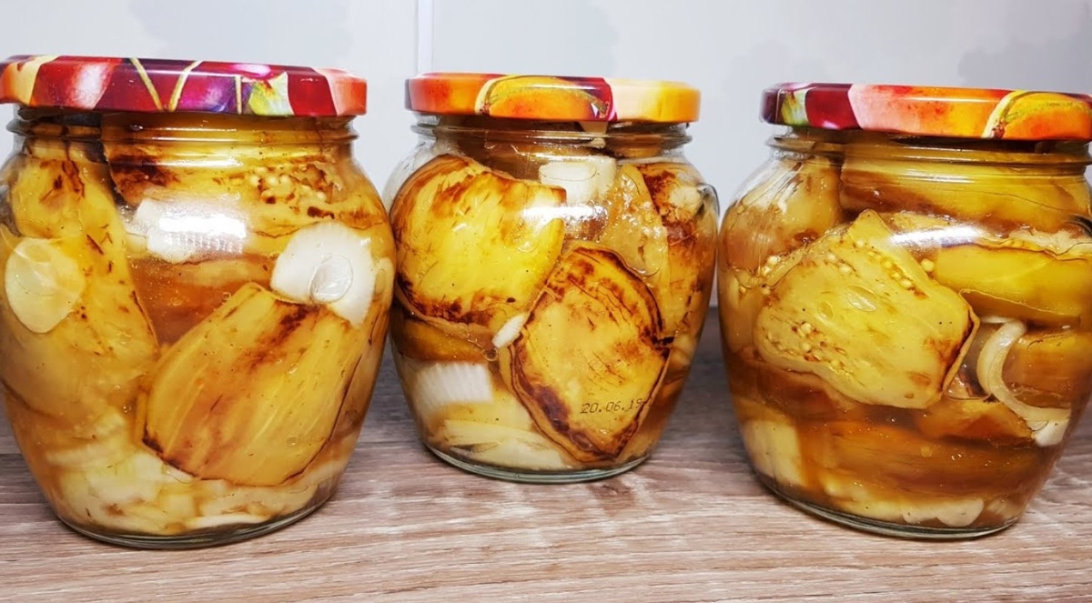 Всем привет.Давайте приготовим на зиму вкусные,ароматные баклажаны от которых не возможно оторваться и отказаться.Готовятся они очень просто и получаются невероятно вкусными. Для начала подготовим баклажаны.Их нужно помыть и обрезать с двух сторон хвостики.Затем убираем кожицу при помощи обычной овощечистки или ножом. Очищенные баклажаны разрезаем по полам и делим половинку на две или три части.Кусочки должны быть довольно крупные. Репчатый лук нарезаем полукольцами. Чеснок слайсами. На разогретую сковородку наливаем растительное масло и обжариваем баклажаны с двух сторон до слегка золотистого цвета. Обжаренные баклажаны отправляем в миску и даем им остыть,а тем временем подготовим маринад. В кастрюлю наливаем воду, добавляем соль, сахар и уксус. Доводим смесь до кипения и варим её одну минуту. Затем снимаем кастрюлю с огня и даем маринаду полностью остыть. Теперь берем большую миску на дно выкладываем в один слой баклажаны посыпаем их слайсами из чеснока,репчатым луком и приправой для