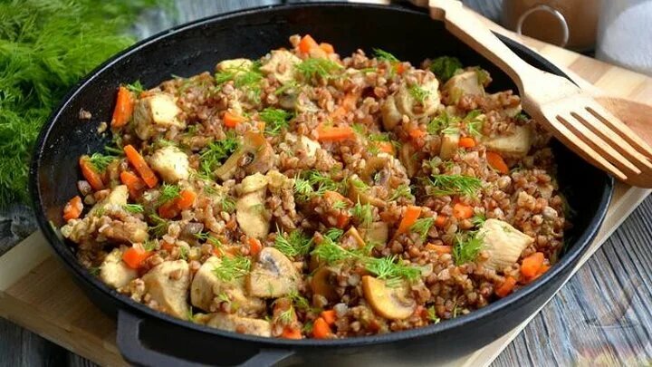 Укроп свежий (для подачи) – 1-2 веточки Пошаговый фото рецепт Подготовьте все ингредиенты по списку. Шампиньоны очистите от загрязнений и нарежьте крупными кусочками. Разогрейте в глубокой сковороде растительное масло, выложите в неё грибы. Обжаривайте шампиньоны на среднем огне со всех сторон 5-6 минут. Пока жарятся грибы, нарежьте очищенную морковь брусочками, а куриное филе - небольшими кубиками со стороной примерно 2 см. Куриное мясо отправьте в сковороду к грибам, обжарьте вместе 2-3 минуты, до изменения цвета курицы. Морковь добавьте в сковороду. Перемешайте и обжарьте ещё 4 минуты, до мягкости моркови. Гречневую крупу хорошо промойте под проточной водой и выложите в сковороду. Туда же всыпьте соль и приправу для курицы. Перемешайт