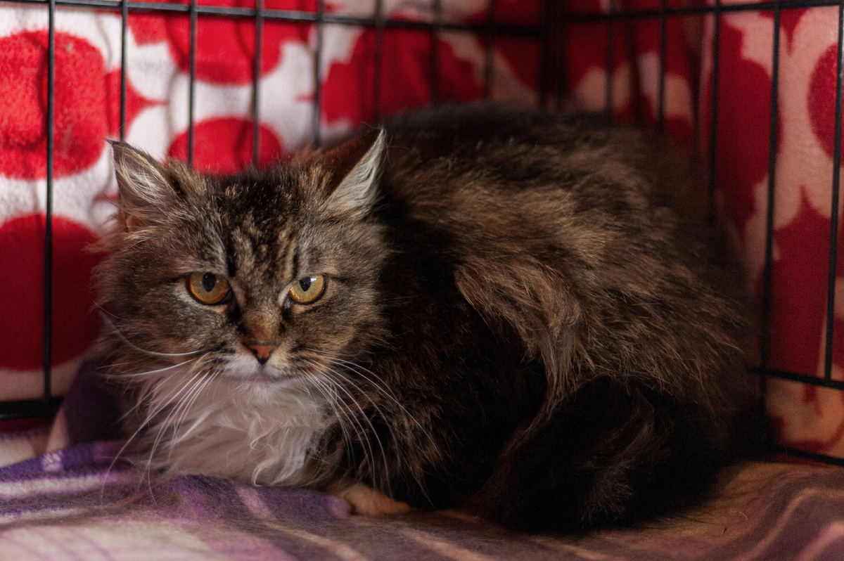 Кася не дикая, но очень осторожная, ей нужно время и внимание, которое я ей дать не могу. Поэтому я решила поселить её в клетке, благо она очень хорошо там себя чувствовала (ещё бы, после нескольких лет на улице), с удовольствием нежилась на подушечках, много спала.