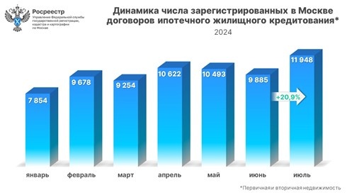 «Москва сохраняет лидирующую позицию среди российских регионов по выданным льготным ипотечным кредитам. Их объем в июле 2024 года составил 33,1 млрд рублей – это 20,8% от общероссийского объема льготной ипотеки. Всего в столице за все время действия программ выдано кредитов на сумму 2,5 трлн рублей», – сообщил заместитель мэра Москвы по вопросам градостроительной политики и строительства Владимир Ефимов. Всего в январе – июле в Москве зарегистрировано 69734 договора жилищной ипотеки. Снижение показателя к аналогичному периоду прошлого года, когда было зарегистрировано 78038 ипотек, составило 10,6%, а к семи месяцам 2022-го (60329), наоборот, зафиксирован рост на 15,6%. Как отметил руководитель Управления Росреестра по Москве Игорь Майданов, июльское число зарегистрированных ипотек превышает все предыдущие показатели 2024 года, установив новый максимум в практически 12 тыс. договоров. «Среди аналогичных месяцев прошлых лет – это второй результат после рекордного 2023 года, когда было за