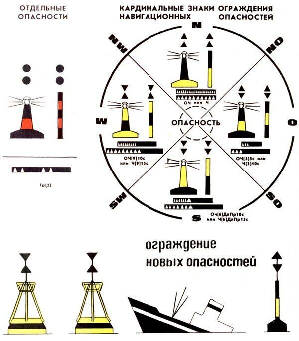 ● северные к N (норду) от опасности - суда должны обойти знак со стороны севера и оставить его к югу («ОСТАВЬ МЕНЯ К ЮГУ»);