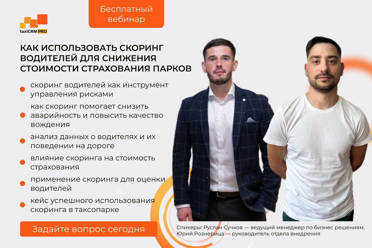На следующей неделе taxiCRM PRO проведёт вебинар на тему "Как использовать скоринг водителей для снижения стоимости страхования парков такси". На вебинаре обсудим: Когда: 27 августа