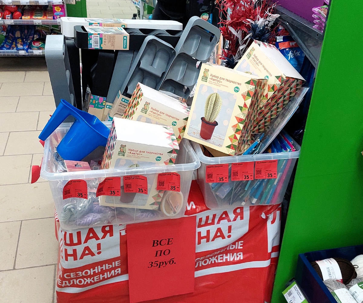 По 35 рублей - Набор для творчества "Кактус". Обратите внимание на коробке наклейка 199 руб. Уточнила на кассе, какой цене верить? Все верно- сейчас этот набор стоит 35 руб. Такое резкое снижение - с 199 руб. опустили на 35 руб.