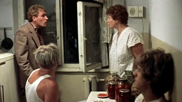 Вон они, на столе стоят. Те самые Ритины заготовки и закрутки. Помидорчики там, огурчики. Варенья и соленья. Компоты, опять же. И вот эти вкусняшки Рите ставят в вину вот уже более 36ти лет))). Почему-то домашние заготовки на зиму из овощей и фруктов в данном фильме сделали символом мещанства, ограниченности, недалёкости и вообще такжитьнельзя)))). Замечу, что сами критиканы (включая Сережу) совершенно не откажутся от ароматных компотов, сладких варений, маринованных кисло-сладких помидоров с веточками укропа, соленых хрустящих огурчиков с прилипшими к ним листочками смородины и лаврушкой и всяких прочих грибочков и квашеных капусток под варёную картошечку)))). Так отчего же женщина, делающая заготовки на зиму, которые потом активно и аппетитно поедаются, в фильме позиционируется как ограниченная и остановившаяся в своём развитии особа? Можно подумать, что так называемые хулители, которых Верка назвала интэлэхэнтами, питаются исключительно святым духом и росой с цветков))) Как бы не т
