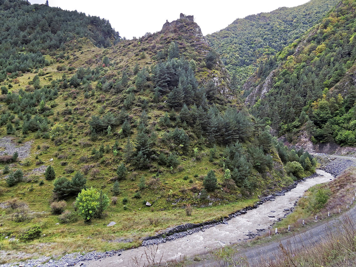 В 100 километрах от Жинвали, в 150 от Тбилиси, примерно в 4 часах пути (где, кстати, и тбилисская маршрутка раз в день ходит), ущелье вдруг делает крутой поворот. А над ним не сразу даже разглядишь сливающуюся со скалами крепость. Она прикрывала с севера Шатили - столицу Хевсуретии.