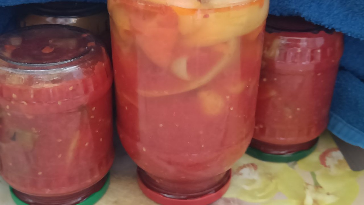 Всем привет! С Вами Татьяна, пенсионерка. Мне 73 года, рост 151 см, вес 56,9 кг ✅ 27.02.23 мой вес был 82 кг. В процессе своего похудения в течение года на дефиците калорий, я сбросила 25 кг лишнего веса. *** Утро начали с заготовки, закатали перец и баклажаны в томатном соке. Перца было 1,2 кг, 🍆 баклажанов 1 кг, томатный сок 2,6 кг. Перец нарезали крупными дольками, баклажаны отварили в подсоленной воде с лавровым листом. Приготовили томатный сок - перемололи в мясорубке 🍅 помидоры, довели до кипения, варили 5 минут, добавили сахар, соль, растительное масло, уксус и лавровый лист, поварили еще 5 минут. В томатный сок выложили часть перца, поварили 5 минут и переложили в банку и сразу закрыли крышкой. И так по частям сварили и закрыли перец, получилось 1 х1,5л банка и 2х600г. Баклажаны 🍆, после варки остыли, мы их почистили, нарезали крупными брусочками, разложили в подготовленные банки и залили кипящим томатным соком, получилось 2х600 г банки. Ждать зимы не будем,