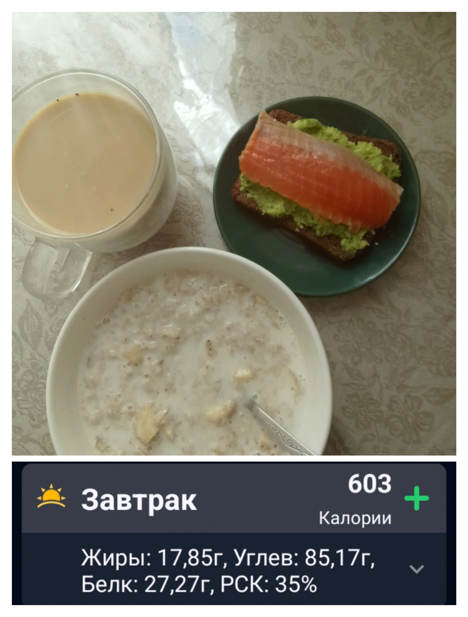 Приветствую вас, друзья , подписчики и гости канала . Я худеющая мама трёх мальчишек . Что-то я ничего не успеваю и задерживаю отчёты по похудению , а также другие публикации . То у меня телефон занят, то самой некогда, другие дела требуют внимания . Вчера плохо себя чувствовала к тому же. Поэтому сегодня отчёт кратенький. По питанию уложилась в свои расчётные показатели . Пост закончился, и я смогу немного разнообразить меню. Но в этот день ещё была рыба. На завтрак овсянка с бананом, бородинский хлеб с авокадо и форелью, кофе. Готовила запеченую рыбу - морской окунь , это одна из любимых моих рыб. Очень вкусная. Была она будет меня и на обед и на ужин. Разница только в количестве . Ещё на перекус был кофе с протеиновым батончиком . По общей калорийности все нормально вышло за день. Из-за очень плохого самочувствия никакой активности не добавляла, по ощущениям казалось ,что поднималось давление, но тонометр ничего не показал, а плохо было . Я даже не ходила с детьми гулять. Поэтому