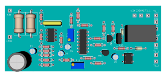 Чертёж печатной платы для схемы автомата показан на рисунке выше. Трансформатор Т1 – любой маломощный с напряжением вторичной обмотки 14 В. На плате обмотки подключаются: первичная – T1_1, вторичная – T2_2.
