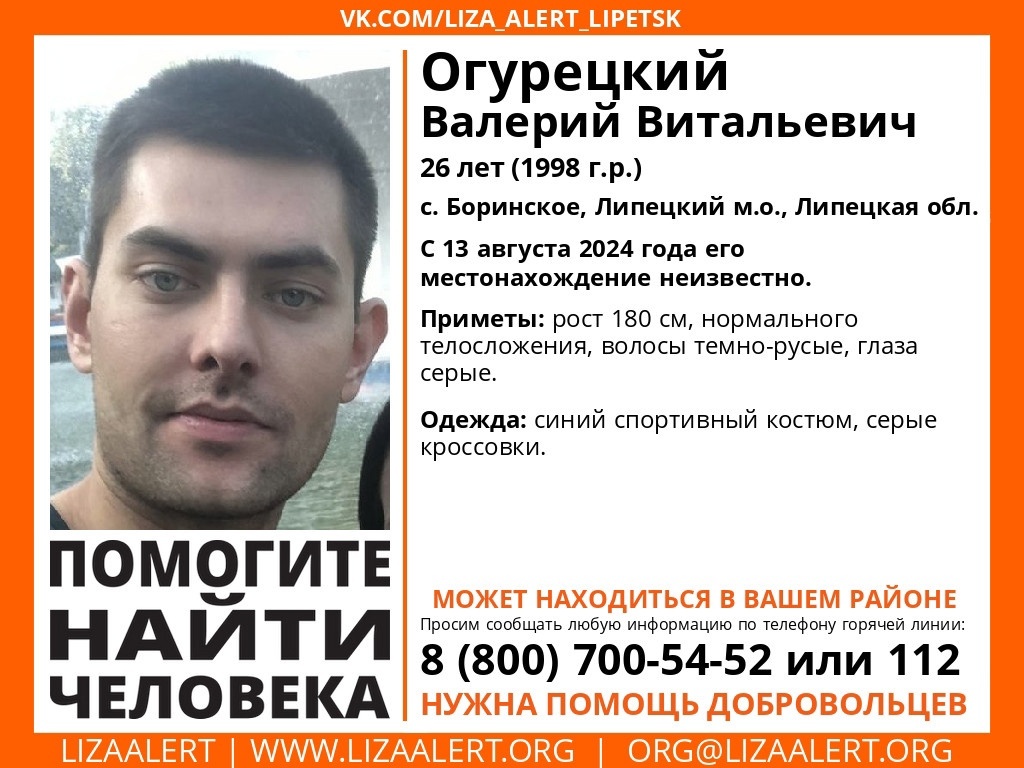 В Липецкой области 2 недели ищут 26-летнего парня. Как сообщили в региональном поисково-спасательном отряде «Лиза Алерт» Валерий Витальевич Огурецкий 13 августа вышел из дома в селе Боринское Липецкого района. С тех пор о его местонахождении ничего не известно. Молодой человек высокого роста — 180 сантиметров. У него нормальное телосложение, темно-русые волосы и серые глаза. В день исчезновения он был одет в синий спортивный костюм и серые кроссовки. Всех, у кого есть информация о его местонахождении, просят связаться с волонтерами или полицией по телефонам 8 800 700 54 52 или 112. Кроме того, в регионе продолжают искать 15-летнюю девочку-подростка, 46-летнего мужчину, нуждающегося в помощи медиков, и 71-летнюю пенсионерку с потерей памяти.