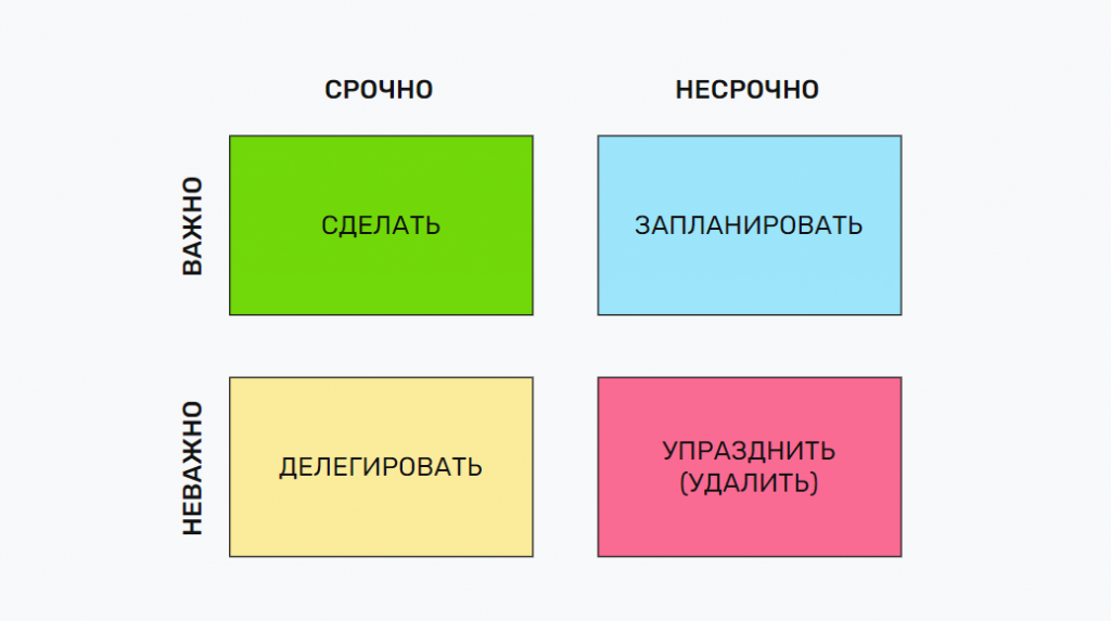 Для этого можно использовать метод Дэвида Эйзенхауэра, который помогает понять, в какой очерёдности решать задачи. Распределяя дела, нужно задать себе два вопроса: «Задача важная?» и «Она срочная?».