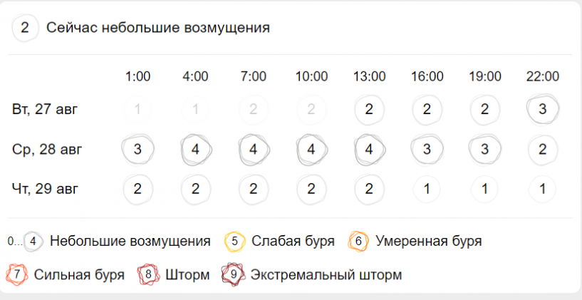 Пока магнитосфера остаётся спокойной, однако уже вечером 27 августа новосибирцы могут почувствовать магнитные колебания. Фото: скриншот сайта Gismeteo На протяжении всего дня К-индекс составит два балла, что характеризуется как слабое геомагнитное возмущение. К 22:00 вечера магнитные возмущения достигнут трёх баллов, а уже к 4:00 утра 28 августа — четырёх баллов. Такая магнитная буря считается слабой, но может вызвать недомогание у метeозависимых людей. У них может возникать головная боль и общая усталость, скачки артериального давления, снижение концентрации и внимания. На время магнитных бурь стоит воздержаться от тяжёлой физической активности, избегать переутомления, придерживаться здорового сна и питания.