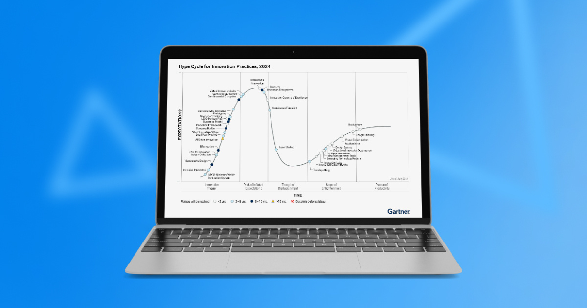 Управление инновациями - относительно зрелая дисциплина с широким спектром устоявшихся методик, о чем говорит их широкое распределение по всей кривой Hype Cycle. Посмотрим внимательно на инновационные практики, которые в ближайшие два года принесут бизнесу выгоду (белые кружочки в правой части графика - на подъеме просветления и плато продуктивности). Источник