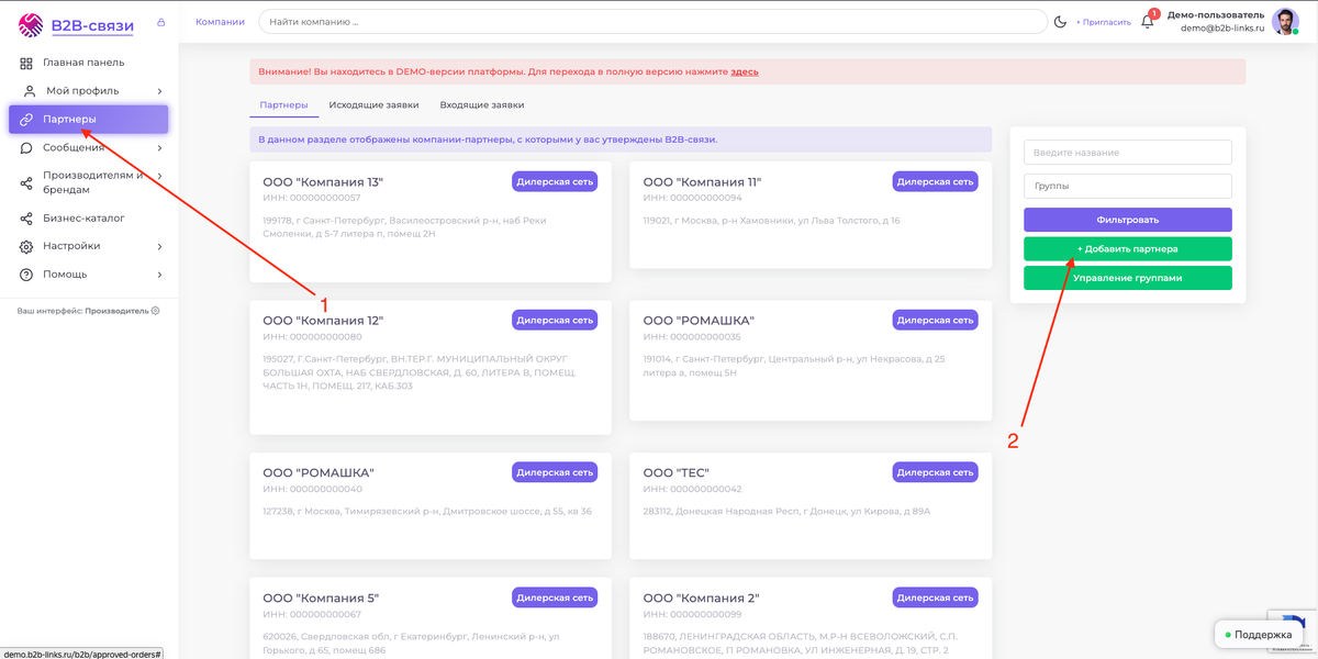 Сегодня узнаем как пригласить партнера в платформу и создать с ним B2B-связь. Видео-инструкция Текстовая инструкция 1. Выберите в левом меню "Партнеры" и нажмите кнопку "+ Добавить партнера"; 2. Выберите из списка свою компанию. Если в списке нет вашей компании, добавьте ее на странице "Компания" в разделе "Настройки". 3. Укажите ИНН вашего контрагента и выберите найденную компанию из списка. Группу для партнера можно не заполнять. 4. Нажмите "Создать". Заявка на создание B2B-связи отправлена. Дождитесь, когда контрагент подтвердит вашу заявку. help@adsinc.ru - почта для ваших вопросов и предложений.