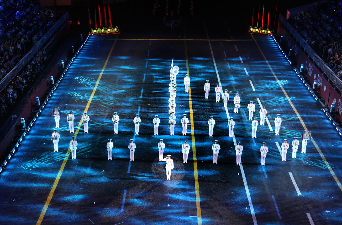 Под звуки всем известной и любимой мелодии «Крейсер Аврора» на брусчатку «выплыл корабль» из музыкантов Адмиралтейского оркестра. Белая парадная форма и Андреевский стяг позволили безошибочно определить военных моряков. Их выступлением лучше наслаждаться сверху, и для этого особенно подходят высокие трибуны Фестиваля. Подготовленный для «Спасской башни» плац-концерт в исполнении музыкантов полон самых разнообразных морских фигур. Тут и «вздымаются» морские волны, и «поднимаются» белые паруса, и «проплывают» огромные пароходы, которые «бросают якорь», — все эти элементы чётко и слаженно выстраиваются оркестрантами.