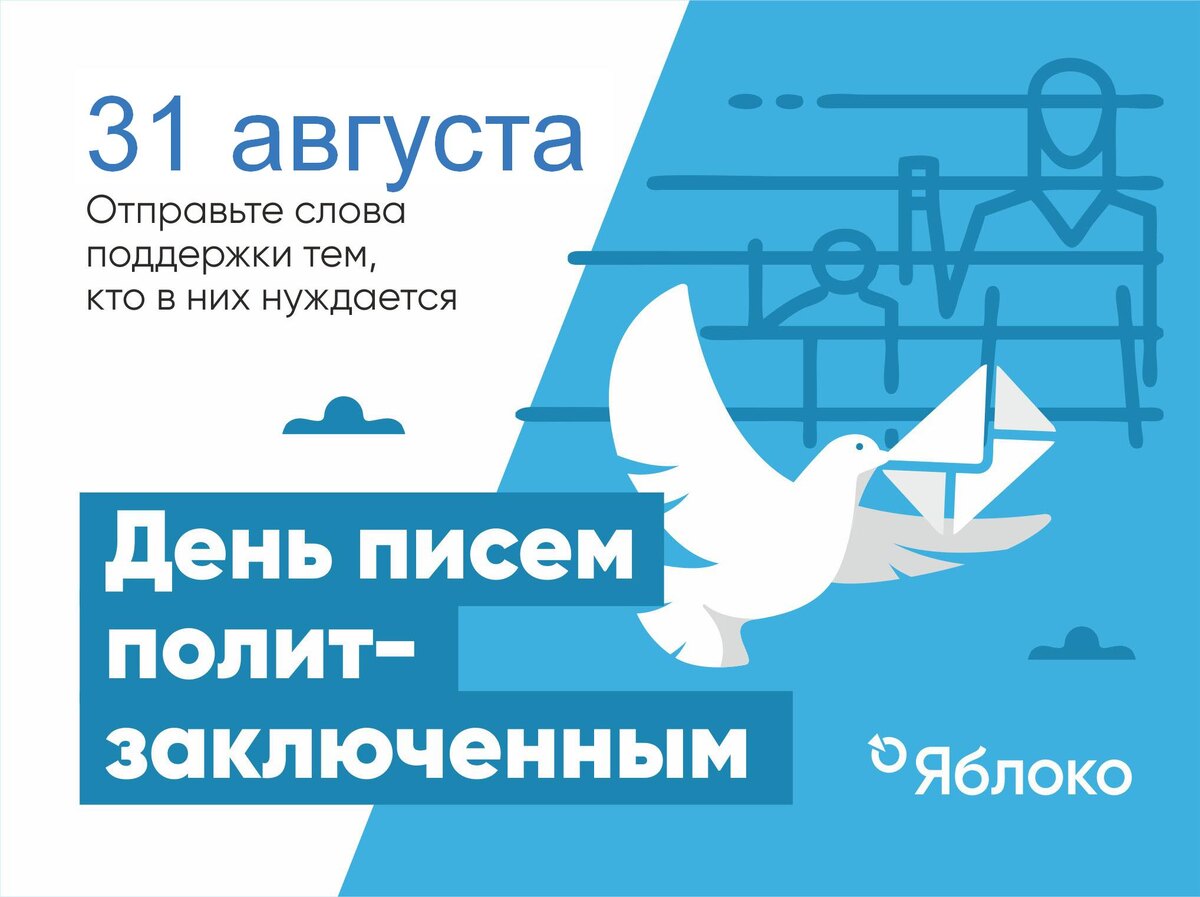 31 августа, суббота, с 14:30 до 18:30 ч. Красный проспект, д.39, оф. 303 Несмотря на освобождение шестнадцати политзаключенных в результате международного обмена, списки российских узников совести пополняются новыми именами. Преследуемых по политическим мотивам в отечественных тюрьмах почти восемь сотен по одним данным, по другим – более тысячи. В августе, например, взят под стражу наш очередной однопартиец – журналист и лидер Камчатского «Яблока». Уголовное дело Владимира Ефимова связано с цензурной статьей о «дискредитации армии». Наши письма помогают оставаться на связи с миром тем, кто был лишен свободы за свои убеждения. Приводите на дни писем своих знакомых. Можно принести конверты, сделав свой вклад в проведение мероприятия.
