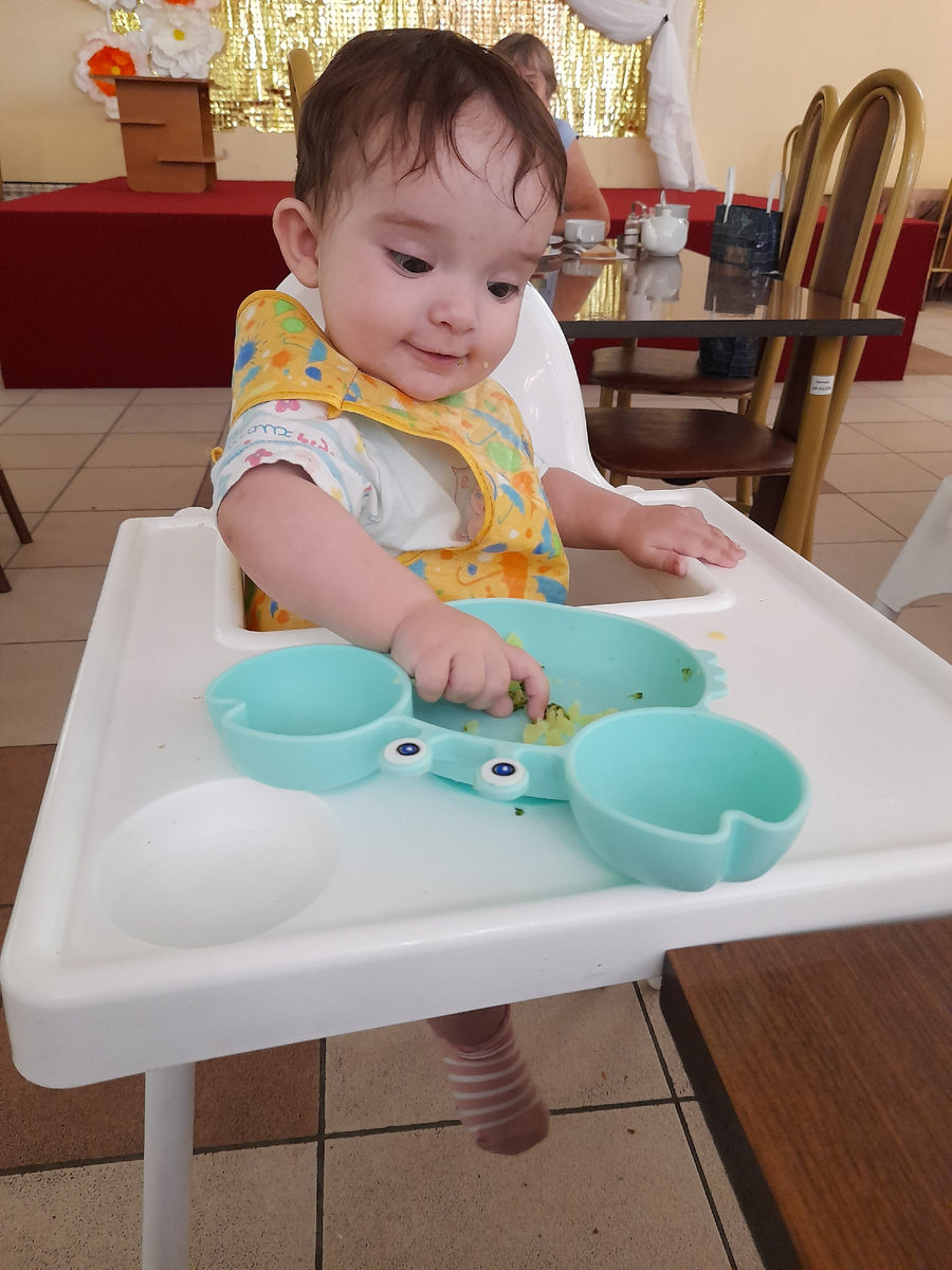 Утром покормили детей кашей, пошли на завтрак. Двойняшкам положили картошечки немного, брокколи и банан. Малыши были счастливы.