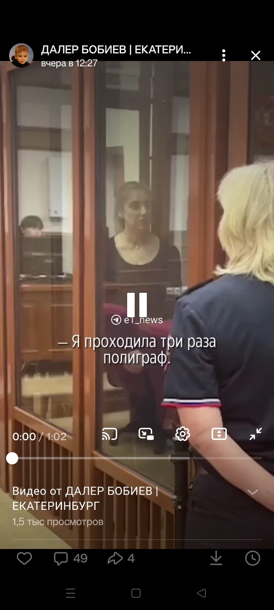 🔊🔊🔊 ЕКАТЕРИНБУРГ ✍ Ранее: https://vk.com/wall-192582409_115012 ❗❗Подборка заявлений В.Л Наумовой для СМИ: ❗❗«На суде Вероника Наумова утверждает, что Далер погиб из-за несчастного случая. ❗❗Она скрыла его смерть из-за того, что не хотела, чтобы пострадал близкий ей человек. О ком шла речь, опекунша не уточнила. ❗❗Вероника Наумова сказала журналисту @e1_news, что за время нахождения в СИЗО она пересмотрела свои жизненные ценности». ❗❗ «Также Вероника не возражает по поводу того, что ей не смягчили меру пресечения ранее. — Раз необходимо, значит необходимо, — ответила она. ❗❗Наумова за год поняла, что в её жизни есть люди, которые будут с ней рядом в любой жизненной ситуации». ❗❗«Наумова заявила, что три раза проходила полиграф. По одному из результатов он показал, что Вероника ни в чем не виновата. ❗❗Но ей сказали, что она обманула полиграф. Журналист задал уточняющий вопрос: — Обманули полиграф? — Да, — отве