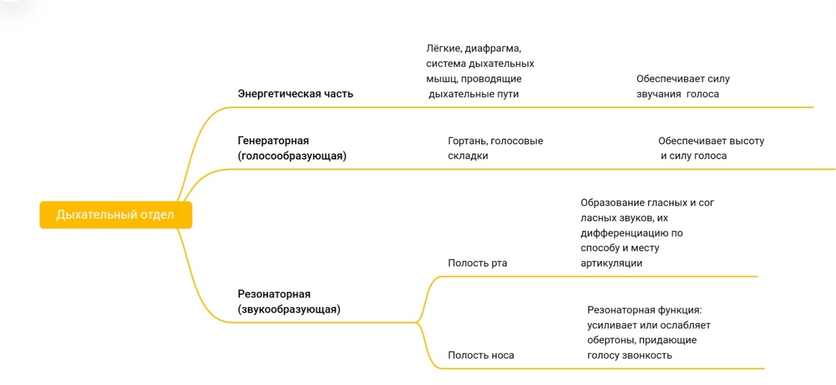 Дыхательный отдел, отвечающий за работу речевого аппарата включает в себя несколько частей. Если мы разговариваем, а струя выдыхаемого воздуха проходит через нос, то речь приобретает носовой оттенок. Это называют открытой назализацией. В норме во время говорения воздух вдыхается носом, проходит через гортань, задевая голосовые складки, и выходит через рот вместе со звуками, которые складываются в понятную членораздельную, наполненную смыслом речь. Диафрагма основная дыхательная мышца, является грудобрюшной преградой. Прикрепляется нижним краем к позвоночнику и грудной кости, имеет куполообразную форму. При сокращении становится плоской, похожей на поршень, опускаясь, увеличивает грудной отдел. При возвращении в спокойное состояние походит на купол и уменьшает объём грудной полости. Работа диафрагмы регулируется диафрагмальными нервами, отходящими от шейного отдела спинного мозга на уровне 4 и 5 позвонков. Межреберные мышцы иннервируются передними ветвями грудных нервов. Возможн