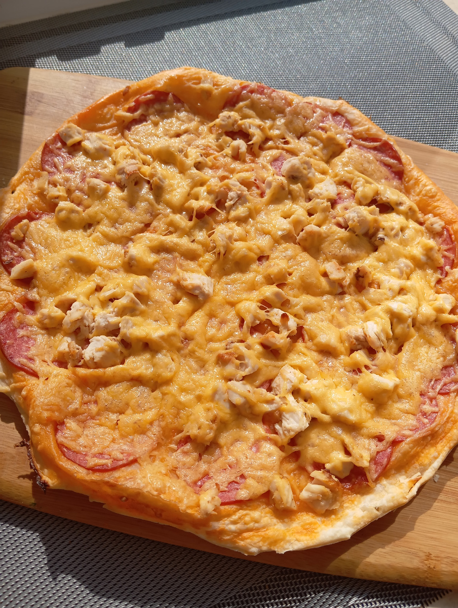 Доброго времени суток, сегодня хочу поделиться идеей приготовления пиццы на слоёном тесте. Для основы нам понадобится : - слоенное без дрожжевое тесто 250 гр На форму диаметром 32 см. Для начинки : Колбаса -150 гр Куринное филе 150 гр Сыр 100 гр Соус 1:1 кетчуп + майонез по 2 ст л. Тесто разморозить, раскатать в тонкий пласт . Смазать соусом доказать начинки на мелкой терке натереть сыр. Отправить в разогретую духовку на 20-25 минут. Всем приятного аппетита.