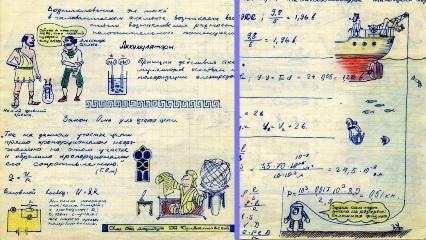 При написании предыдущей статьи я случайно нашла в Интернете (и использовала) несколько картинок из школьной тетради по физике ученика 10 класса далёких 60-х годов прошлого века, которыми была просто заворожена. Высочайший уровень творчества! Десятиклассник сопровождал своими художествами все записи в тетради. Как же шедеврально у него получались эти зарисовки! Одно слово - настоящий творец! Рисунки прекрасные, содержат много юмора, и ведь все они - на тему физики! Как же нужно было быть влюблённым в предмет, чтобы вкладывать в шутливые изображения научное содержание! Эти картинки из школьной тетрадки объясняют - почему в советское время в стране было так много физиков, почему они совершили много научных подвигов! Откуда появились в Интернете эти картинки? Один пользователь решил показать, как вёл конспект по физике его отец, и разместил в Сети около полусотни страниц из отцовской тетради. И мы сегодня можем любоваться на творчество ученика тех лет - вот же какие настоящие творцы в