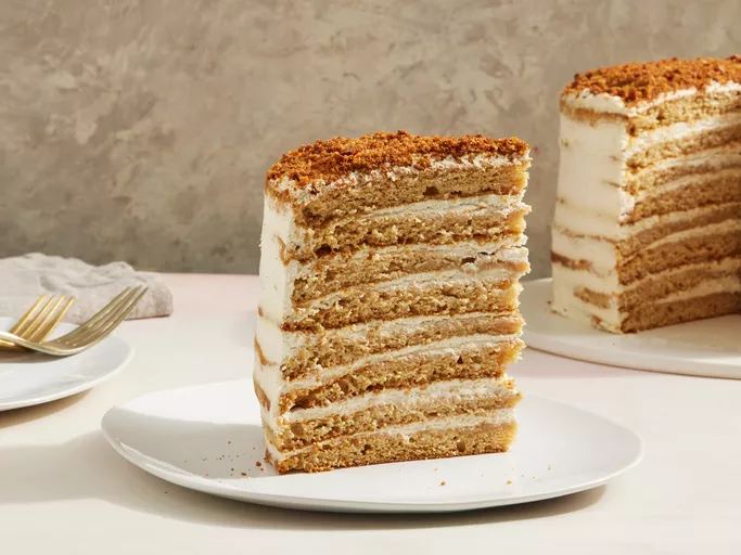 Этот медовый торт можно приготовить тремя разными способами: сложным способом, более сложным способом и тем, как мы собираемся это сделать — самым сложным способом... Потому что это того стоит. Секрет фантастического вкуса этого торта — крошечное количество горечи от подгоревшего меда. Слегка пикантная взбитая сливочная глазурь придает немного кислинки и прекрасную легкую текстуру, и в отличие от других глазурей она не слишком сладкая. Коржи: Крем: Соберите все ингредиенты. Разогрейте духовку до 375 градусов по Фаренгейту (190 градусов по Цельсию). Застелите противень силиконовым ковриком для выпечки. Поставьте миску для смешивания и взбейте в холодильник. Налейте 3/4 стакана дикого меда в глубокую кастрюлю и поставьте на средний огонь. Кипятите, пока мед не потемнеет и не приобретет карамельный аромат, около 10 минут. Выключите огонь и вмешайте холодную воду. Поставьте большую металлическую миску на плиту на самый слабый огонь. Добавьте сахар, масло, 3/4 стакана меда из полевых цвето