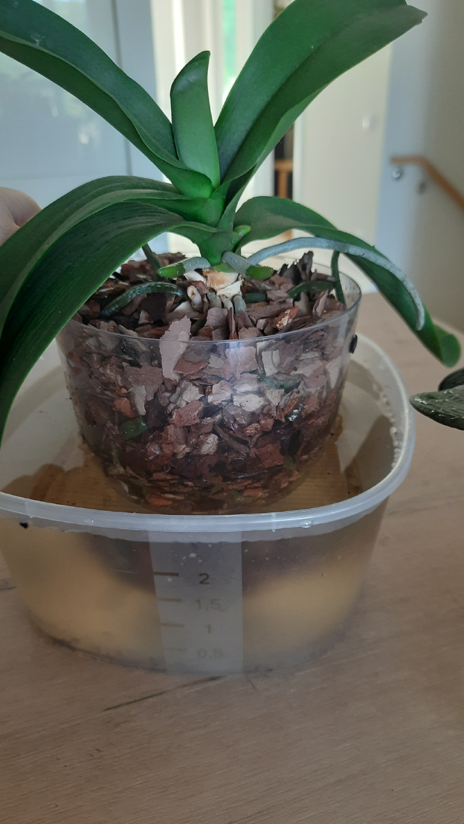 Вместо того, чтобы поливать сверху, а потом сливать все лишние, при этом часть коры остаётся сухой, я делаю по-другому.