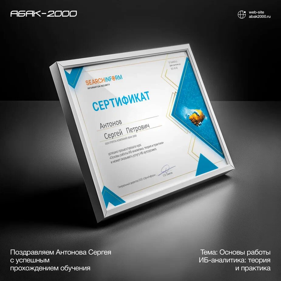 Компания «Абак-2000» продолжает развиваться в сфере информационной безопасности, и мы рады сообщить о новом направлении — ИБ-аутсорсинге. В рамках его развития наши специалисты активно повышают квалификацию. Недавно Сорокин Даниэль успешно завершил обучение по курсу «Как продавать услугу ИБ-аутсорсинга: лучшие практики», а Антонов Сергей прошел курс «Основы работы ИБ-аналитика: теория и практика». Мы уверены, что полученные знания помогут нам еще эффективнее защищать информационные системы наших клиентов. Наш сотрудник поделился своим опытом прохождения обучения: Почему вы решили пройти обучение?