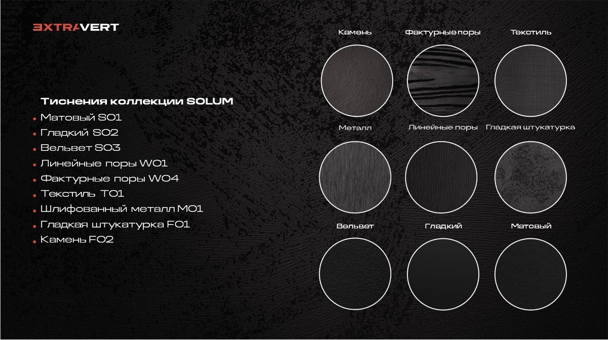 В брендовой коллекции отчественного производителя Экстраверт собрано девять качественных тиснений, с которыми декоры коллекции SOLUM наполняют самые разнообразные дизайнерские проекты.